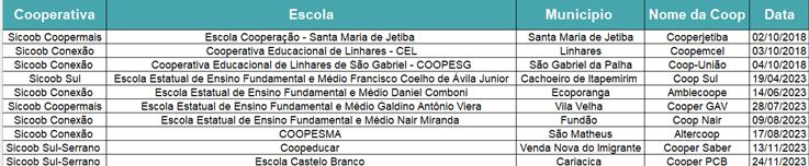 O Sicoob ES conta com 10 cooperativas mirins em 10 municípios do Espírito Santo, envolvendo cerca de 500 alunos associados. Esses grupos desenvolvem projetos com foco no cooperativismo e empreendedorismo, aprendizado prático e impacto positivo nas comunidades.